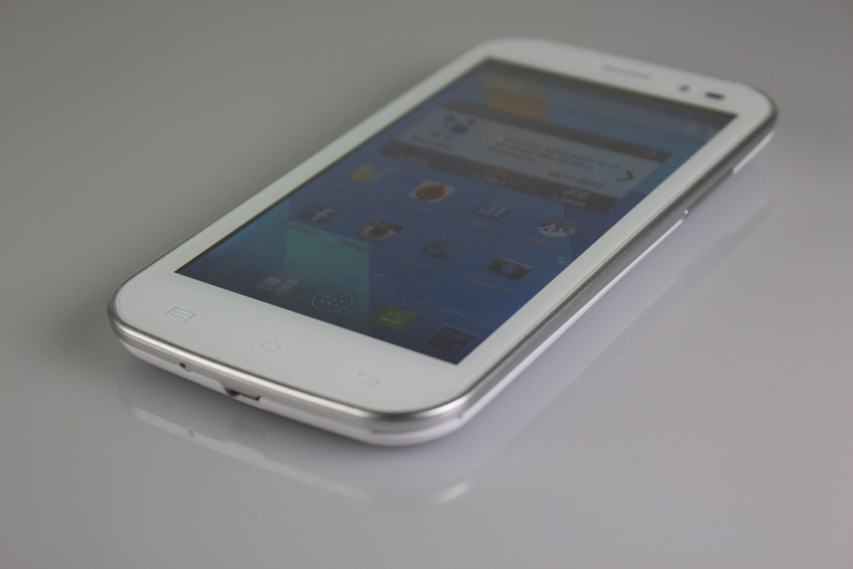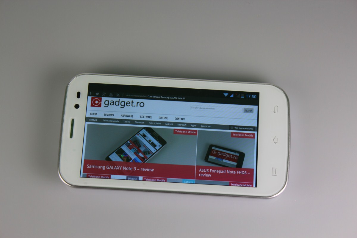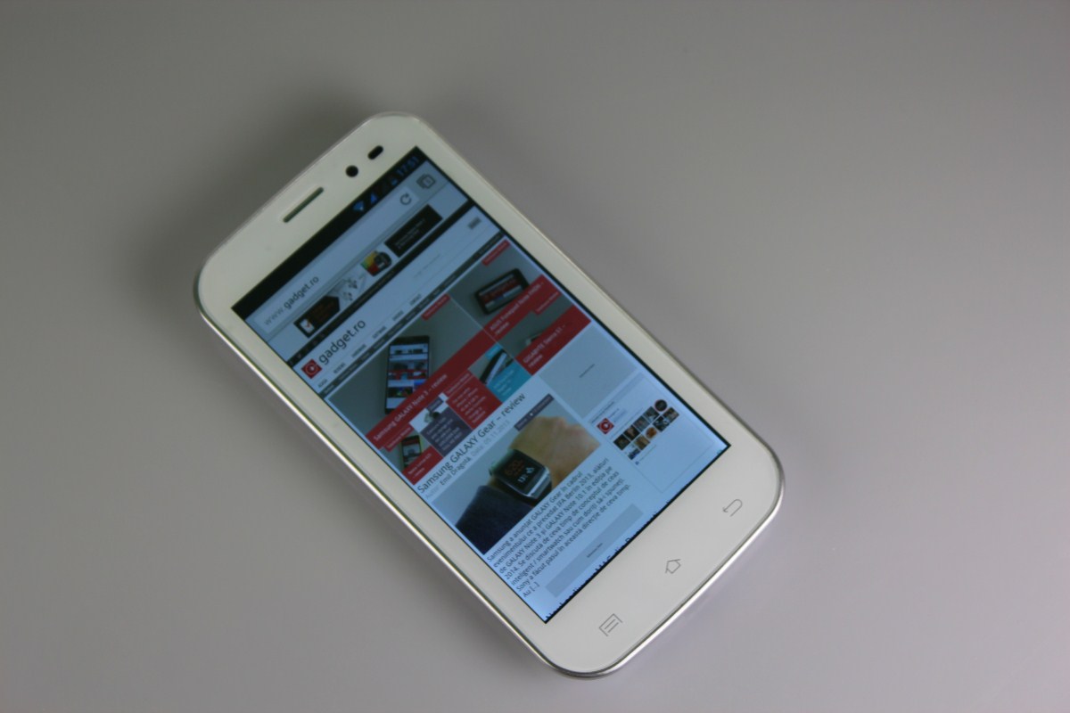IPS de 4.5 inch cu rezoluție HD / 1280×720 pixeli și una dintre primele suprize plăcute. Nu am ce să-i reproșez și-l consider cel mai bun ecran pe care-l poți avea pe un telefon cuprins ca preț între 600 – 800 lei. Punctează pozitiv la mai multe capitole: culori plăcute, unghi de vizualizare, destul de ok și sub acțiunea razelor de soare. La baza ecranului sunt trei taste capacitive cu rolurile Back, Ieșire pe ecranul de start și Mai multe detalii sau customizare a ecranului de start în funcție de poziția în care te afli prin meniu sau aplicații.