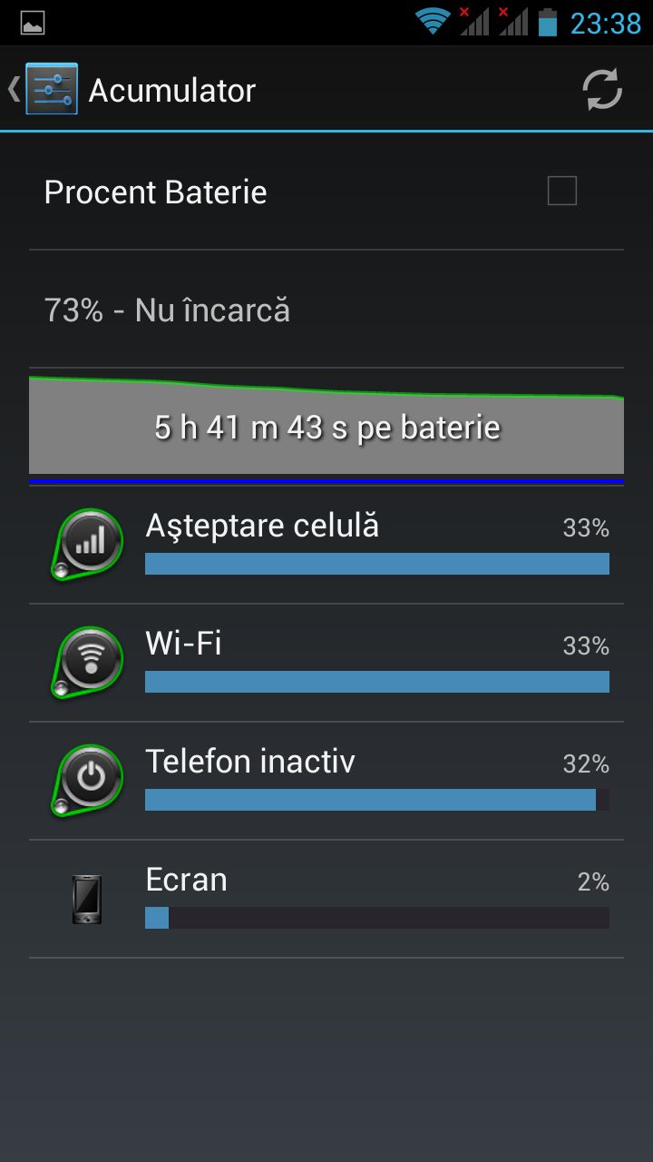 Bateria de 1500 mAh am crezut că nu va face față la consumul dat de display-ul IPS cu rezoluție HD / 1280×720 pixeli + MediaTek quad-core pe ARM Cortex-A7. Nu este atât de slab pe cât mă așteptam, dar nici nu impresionează. Fără sincronizări activate în fundal și cu luminozitatea ecranului dată la o valoare sub 50% în condiții de utilizare moderată reușește să treacă o zi ca autonomie.