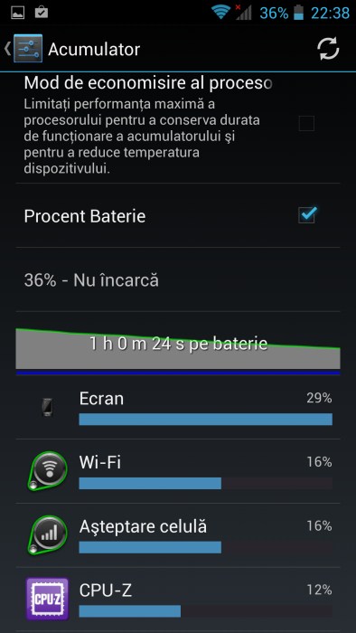 Bateria de 3150 mAh este pusă serios la lucru de către display-ul FHD de 5.5 inch. Cu luminozitatea setată la maxim, jocuri, browsing la modul intensiv și nu trece de testul unei zile de autonomie. Cu display-ul setat la 50% luminozitate și utilizare moderată a phabletului se ajunge să treci o zi întreagă cu o încărcare a acumulatorului integrat de Evolio X6. Mă așteptam la o autonomie ceva mai mare având în vedere capacitatea bateriei și faptul că procesorul nu este unul gurmand, dar se plătește un tribut serios spre ecranul de 5.5 inch și rezoluția ridicată.