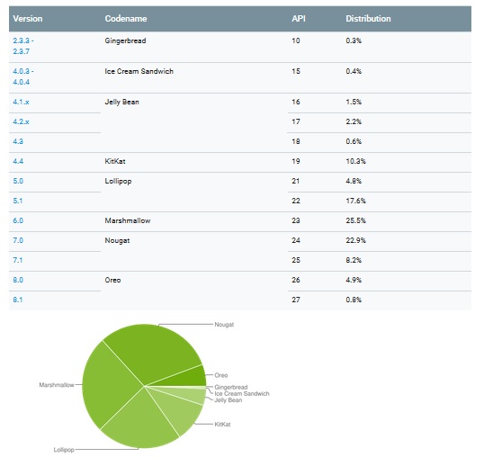 Interesant este că versiuni vechi de 4-5 ani au încă o distribuţie foarte mare, mult peste Android 8.0 Oreo: aici găsim Android 4.4 KitKat (lansat în 2013) cu o cotă de 10.3% şi Android 5.0 / 5.1 Lollipop (lansat în 2014) cu o cotă de 22.4%.
