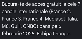 Extraopţiunea tv Orange Internaţional (7 canale tv incluse) este oferită gratuit abonaţilor până pe 6 februarie 2026