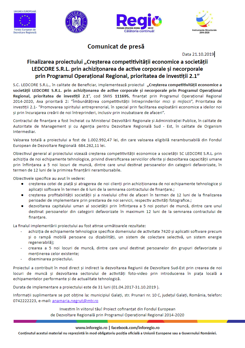 Finalizarea proiectului „Creșterea competitivității economice a societății LEDCORE S.R.L. prin achizițonarea de active corporale și necorporale prin Programul Operațional Regional, prioritatea de investiții 2.1”
