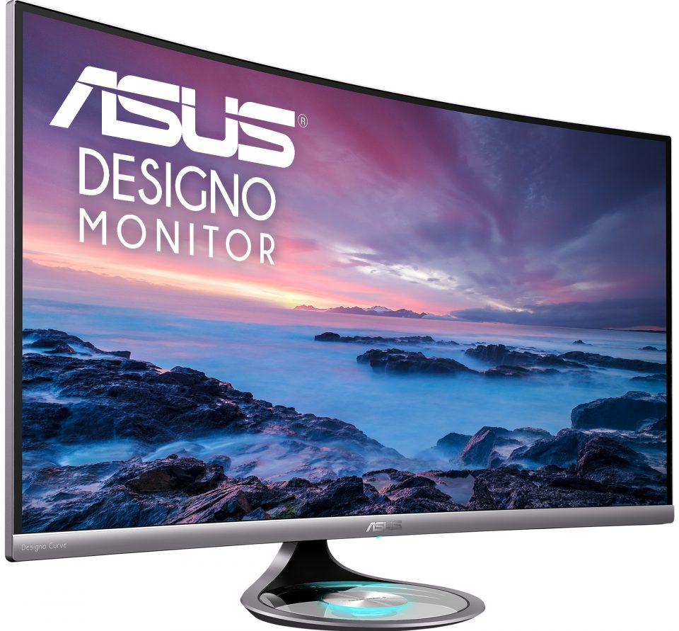 b. ASUS Designo Curve MX32VQ este un monitor cu diagonală mare – 31.5 inch, rezoluție de 2560×1440, panel VA cu aspect 16:9 (cei 31.5 inch se transformă în 80.1 cm în diagonală), curbură 1800R, timp de răspuns de 4 ms, conectivitate asigurată de DisplayPort 1.2, 2 x HDMI, jack de 3.5 mm și jack pentru căștile PC, sunet cu 2 x 8W RMS dezvoltat alături de Harman Kardon. Cântărește 8.6 kg și dimensiunile sale sunt de 713.4 x 501.2 x 239.7 mm cu standul inclus. Luminozitatea este de 300 cd / mp. Avem și tehnologiile Halo Lighting Base (personalizare a luminilor aflate la bază prin corelarea cu sunetul), Low-Blue Light și Flicer-Free, dar și suport pentru Adaptive Sync / FreeSync.