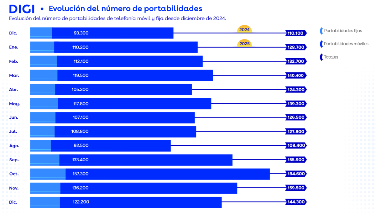 DIGI Spania a reuşit să porteze în 2025 un total de 1.672.400 numere de telefon astfel: