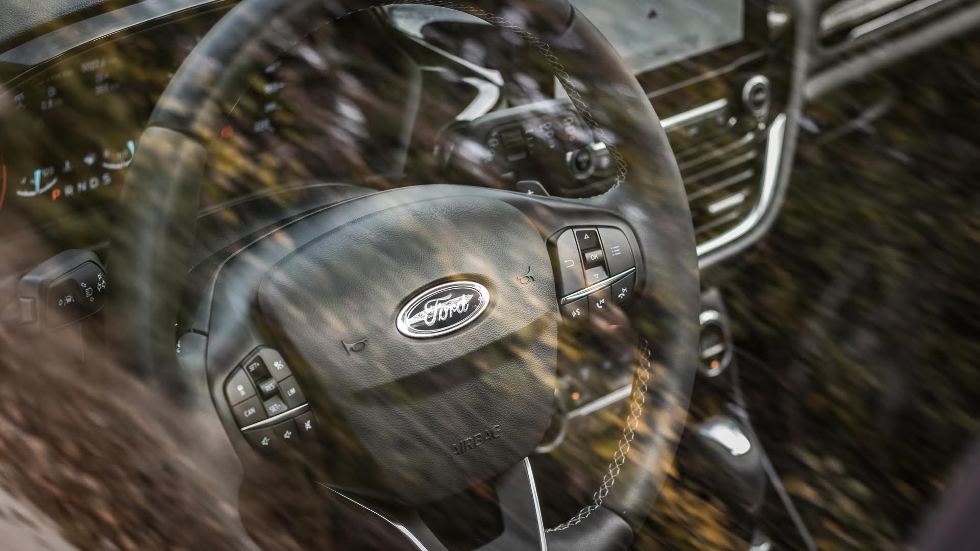 Aș putea spune că o primă idee despre câtă tehnologie este adusă pe Ford Fiesta Active îți poți face când analizezi numărul de butoane de pe volan. Sunt acolo comenzi pentru pilotul automat adaptiv, câteva comenzi de bază pentru sistemul SYNC III (gen reglarea volumului sau activarea comenzilor vocale) și butoane pentru computerul de bord. În total? 14 butoane, dintre care două cu câte 3 funcții (sus/jos și apăsare).