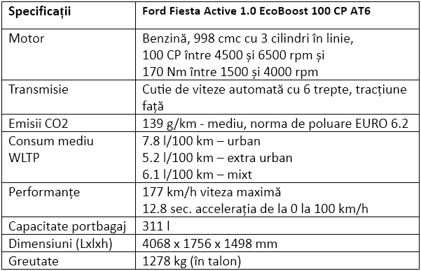 Specificații pentru Ford Fiesta Active 1.0 EcoBoost 100 CP AT6