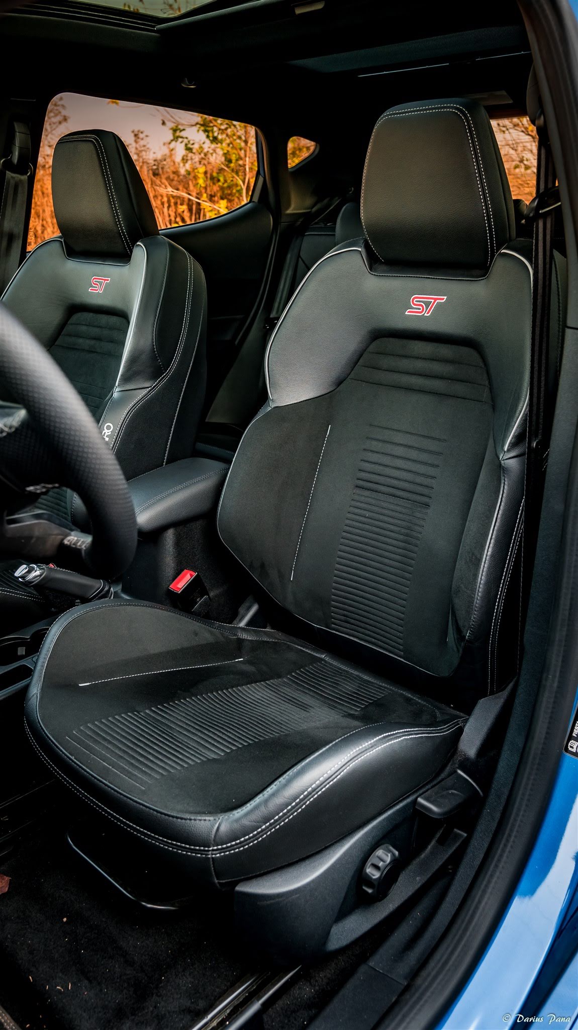 Opțional, mașina de test a primit echipamente ca faruri Full LED ST, pachet Confort 1a (scaune față, volan și parbriz încălzite), plafon panoramic cu deschidere și vopsea metalizată Ford Performance Blue.