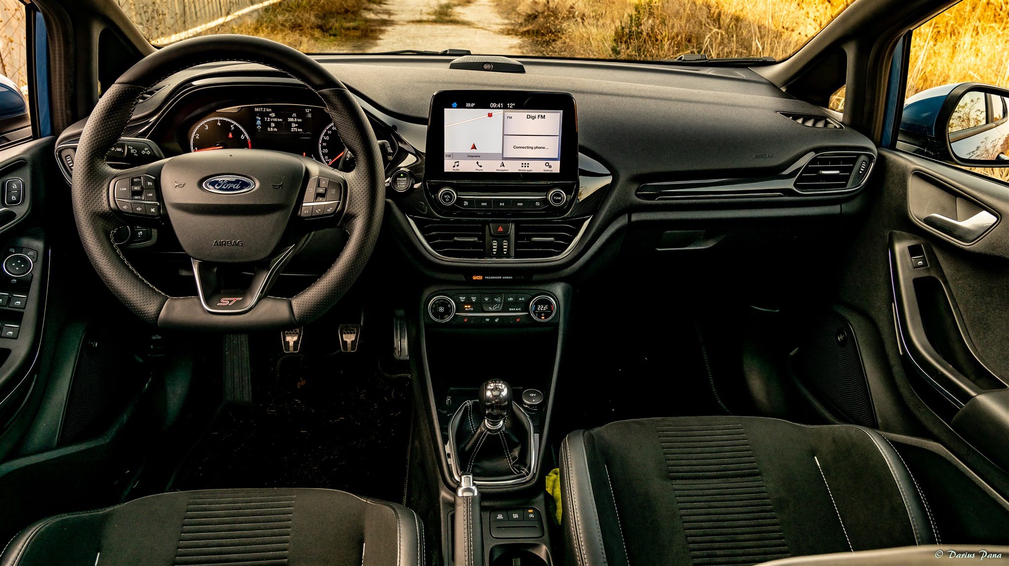 În interior se păstrează în mare parte același tratament. Dacă nu ar fi existat scaunele Recaro cu profil sportiv agresiv și logo ST cu greu ai fi remarcat celelalte accesorii menite să individualizeze această versiune de Fiesta.