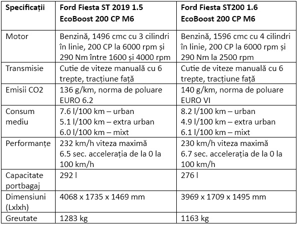 Specificații pentru Ford Fiesta ST 2019 1.5 EcoBoost 200 CP M6 (comparație cu vechea generație)