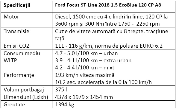 Am testat la sfârșit de octombrie un Ford Focus ST-Line cu motor diesel de 1.5 litri cuplat la o transmisie automată cu 8 trepte, noutate în gamă.