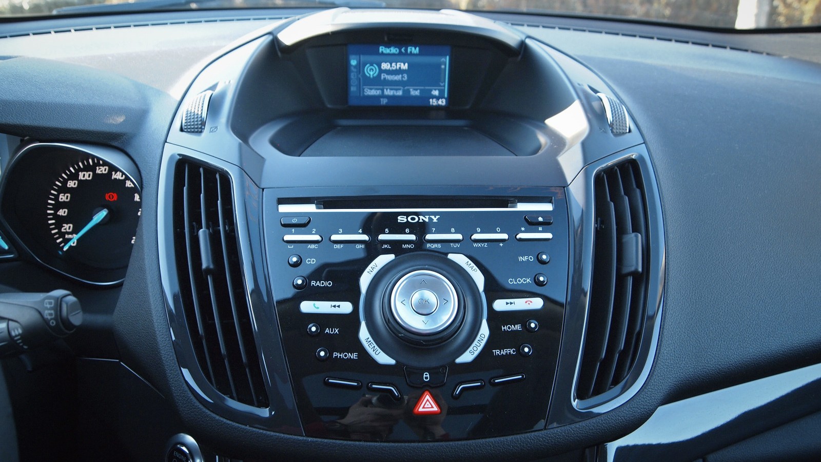 Mașina de test a venit echipată cu sistem de infotainment SYNC din prima generație, cu ecran color mic, de numai 3.5 inci. Comenzile acestui sistem nu sunt cele mai ergonomice, centrala de comandă Sony având foarte multe butoane mici, destul de greu de accesat în primă instanță. Sunt sigur că după câteva zile te obișnuiești, dar în cazul meu, după câteva ore bune în compania Fordului Kuga încă mai căutam comenzile.