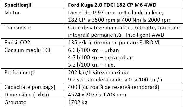 Am avut pentru test un Ford Kuga cu cel mai puternic motor diesel din oferta disponibilă la noi în țară. Este vorba de unitatea cu patru cilindri în linie, având capacitatea de 1997 cmc, care furnizează o putere maximă de 182 CP la 3500 rpm. Mai important decât caii putere este cuplul motor: cu 400 de Nm disponibili la 2000 rpm nu vei avea probleme nici cu mașina încărcată la capacitate maximă.