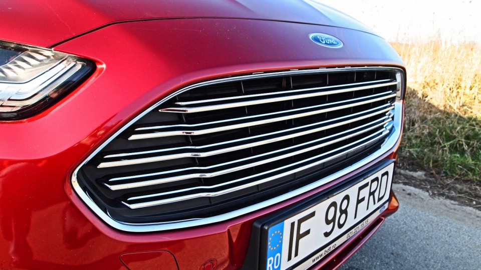 Cert este că Ford a reușit să deseneze un automobil dinamic, sportiv, dar elegant în același timp, cu câteva elemente cromate așezate pe caroserie. Sigur că mulți dintre voi veți vorbi despre partea din față, mai exact despre grila hexagonală ce pare o copie fidelă a uneia de la Aston Martin. Ei și ce dacă Ford a împrumutat ceva de la exclusivistul producător britanic?! Nu încape nicio îndoială că Mondeo 2014 integrează cel mai natural noua grilă și, de fapt, noua identitate vizuală de marcă.