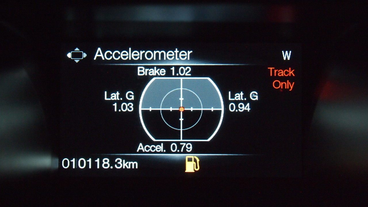 Avem informațiile uzuale ca Trip A sau B, consum și viteză medie, presiune în pneuri, dar și unele dintre cele mai interesante detalii. Putem alege să afișăm pe ecranul de 4.2 inch forța G pe care o resimt pasagerii (pe axa longitudinală și laterală), temperatura aerului de admisie sau presiunea din turbina de supraalimentare, cronometrăm automat accelerația până la 50, 100, 150 sau 200 km/h, durata de parcurgere a distanței de 200 sau 400 metri cu start de pe loc, ș.a. Am făcut mai multe poze computerului de bord spre a exemplifica cât mai clar ce informații oferă acesta: