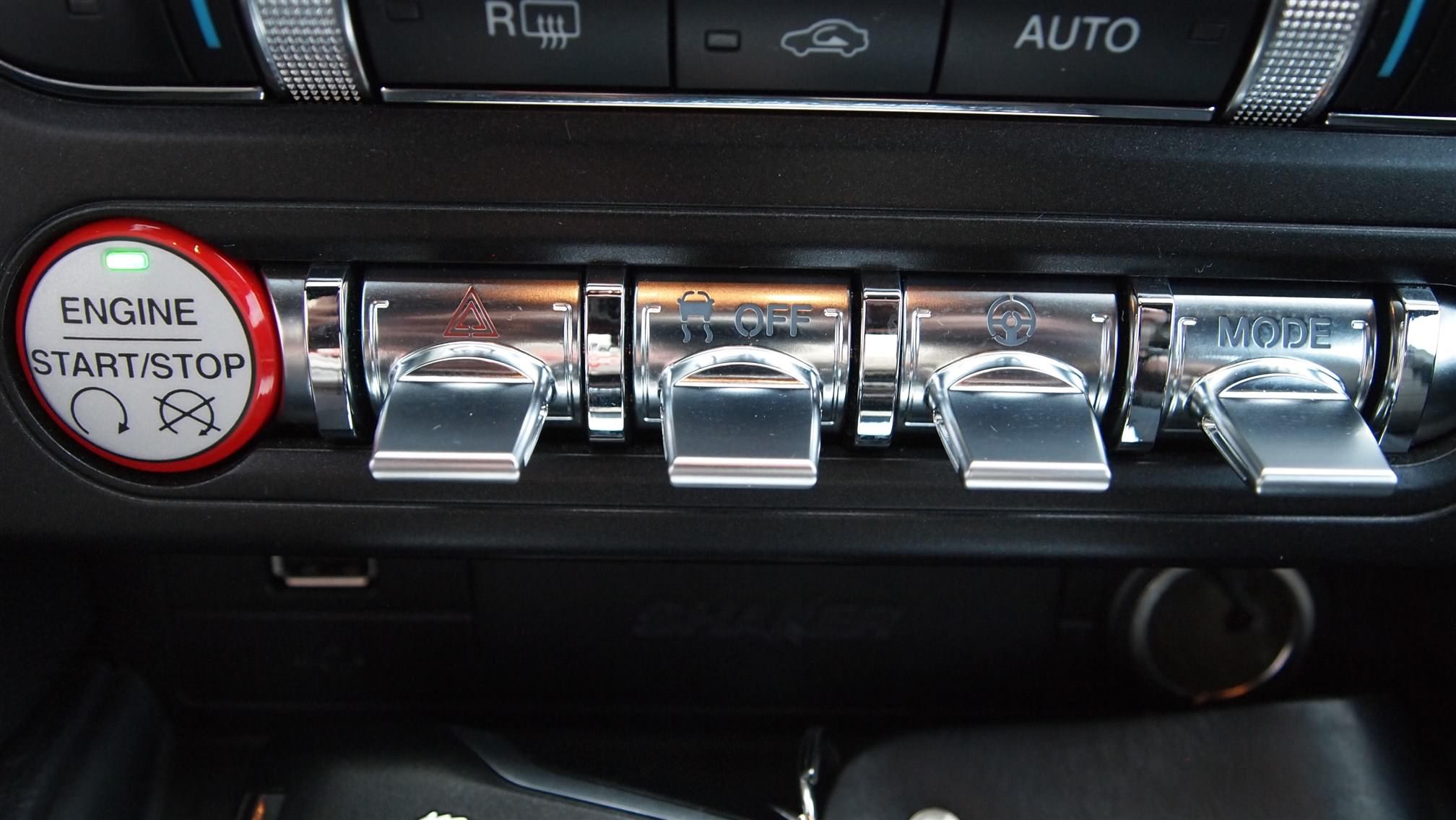 Per total, senzația primită din interiorul Mustang-ului este una plăcută. Am apreciat simetria planșei, ergonomia comenzilor, mai puțin cea a butoanelor de sub zona climatizării automate. Aici avem butonul rotund pentru Start/Stop motor și alte patru leviere, inspirate din cele aeronautice. Acestea mă așteptam să poată fi apăsate ori ridicate, însă doar a doua manevră este posibilă. Nu-i nimic atât de grav, te obișnuiești destul de repede cu ele.