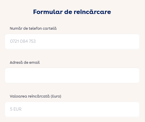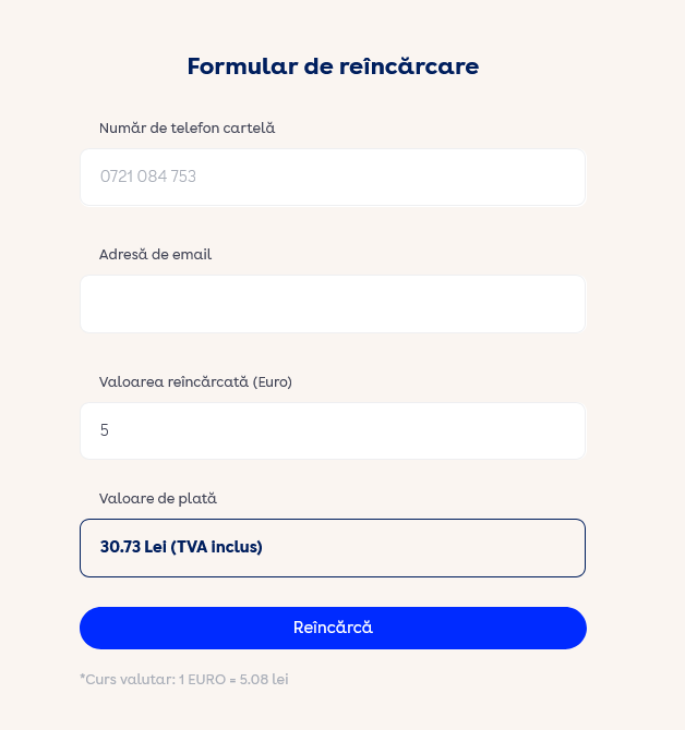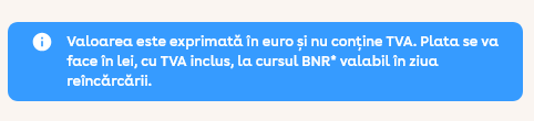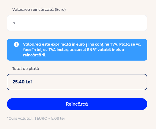 Sub câmpul „Valoarea reîncărcată (Euro)” apare următorul mesaj: „Valoarea este exprimată în euro şi nu conţine TVA. Plata se va face în lei, cu TVA inclus, la cursul BNR valabil în ziua reîncărcării”.