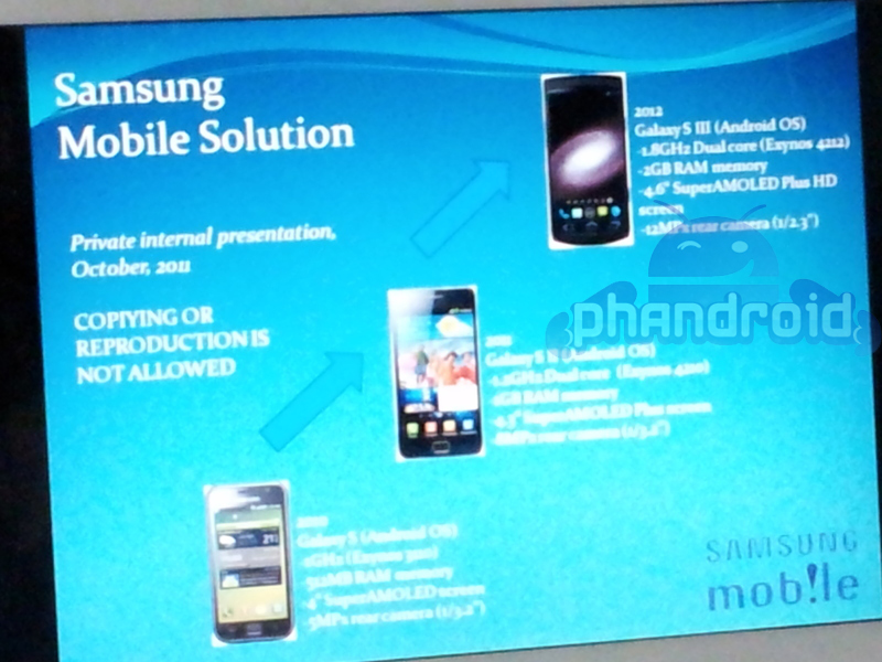 [update] Se pare că imaginea prezentată este un fals: s-au găsit greșeli în ce privește exprimarea (copiying) și alte nereguli (ecranul este scris ‘Super AMOLED Plus HD’ deși terminologia pe care o folosește Samsung este de fapt ‘HD Super AMOLED’ ;primul Galaxy S este scris ca având un procesor Exynos) – mulțumim Liviu pentru avertizare.