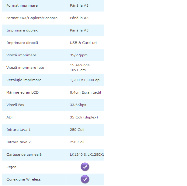 Precum cele două imprimante prezentate mai sus, și acest model vine cu imprimare față-verso, la care se adaugă scanarea și faxarea duplex. Setările se pot realiza pe ecranul tactil TFT de 8.3 cm. Conectivitatea rămâne aceeași ca la modelele de mai sus.