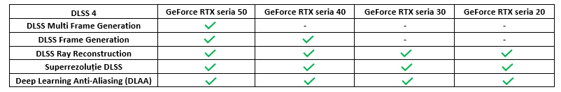 Pentru a beneficia de toate funcționalitățile tehnologiei DLSS 4, este necesară o placă grafică din seria GeForce RTX 50. Cu toate acestea, anumite componente ale DLSS 4, precum Super Resolution și Ray Reconstruction, sunt disponibile și pentru seriile RTX 20 și RTX 30.