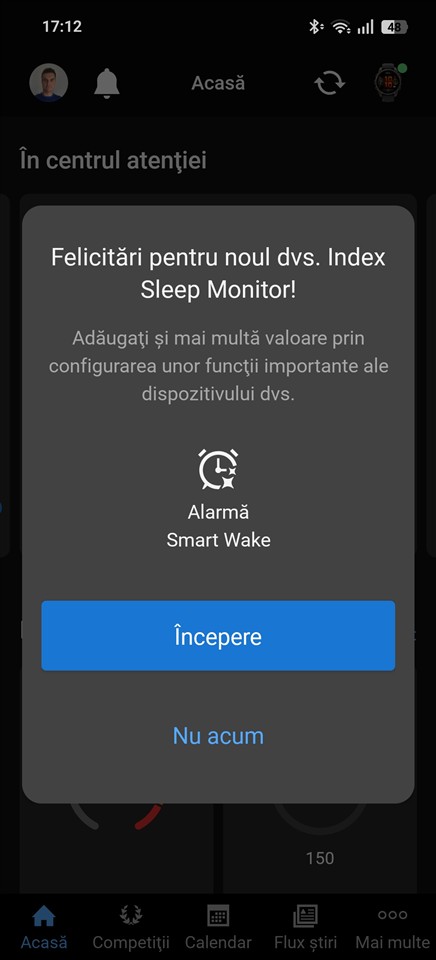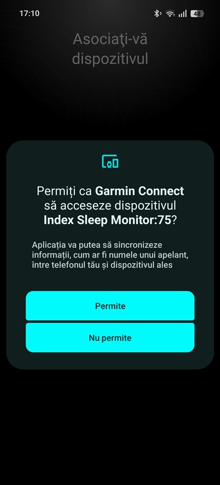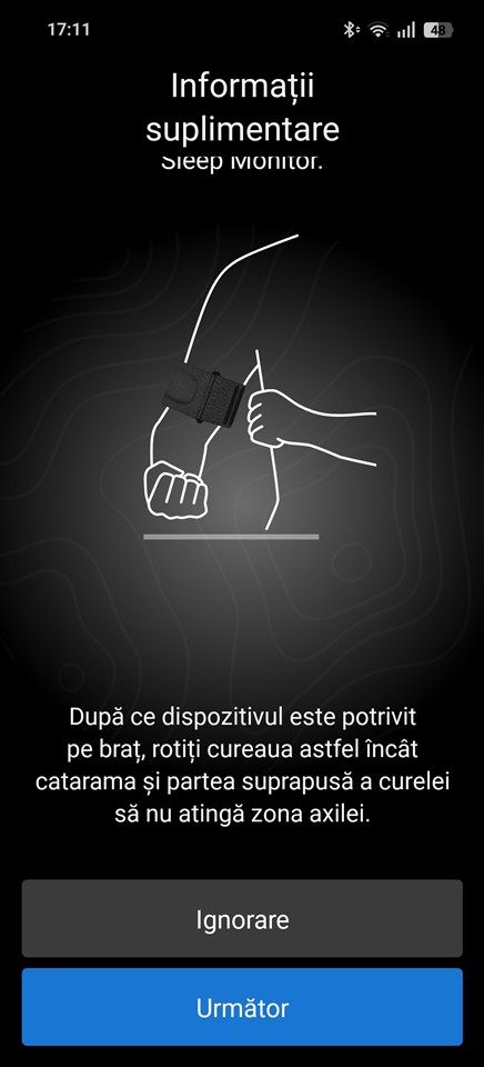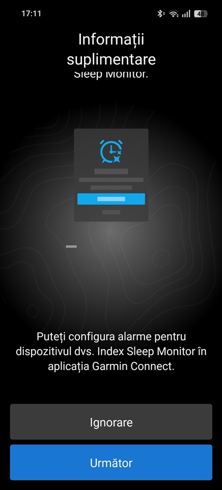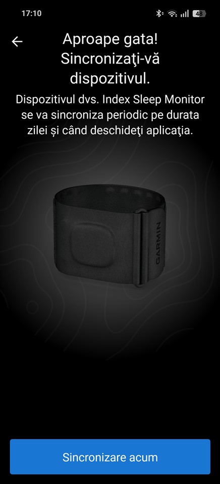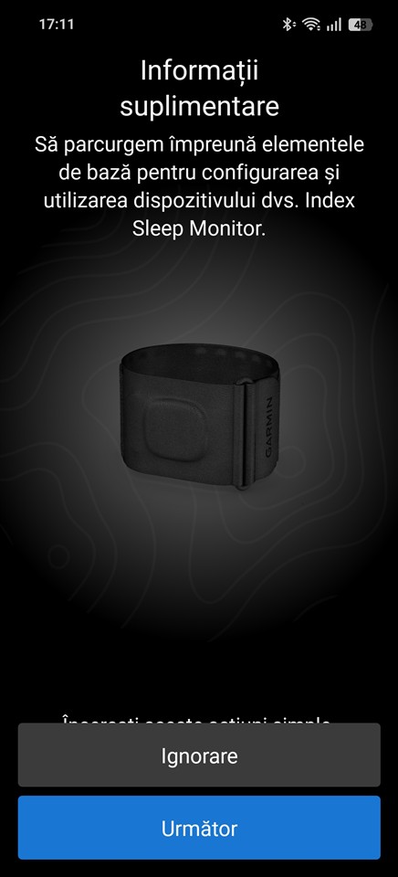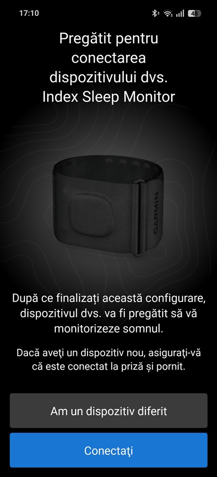 Apoi, dacă nu ai deja un dispozitiv Garmin, atunci va fi nevoie să instalezi aplicația Garmin Connect. Eu aveam Garmin Venu X1, deci odată ce am pus Garmin Index Sleep Monitor la braț, acesta a fost imediat descoperit de aplicație, care m-a și ghidat apoi pas cu pas spre a configura totul așa cum trebuie, dar și după preferințele mele.
