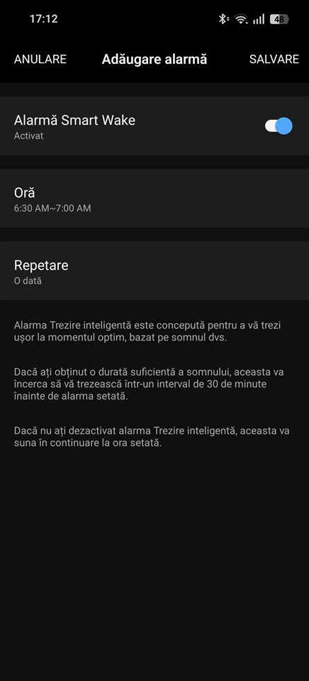 Ce mai poate face Garmin Index Sleep Monitor este să te trezească, prin vibrații. Poți seta o alarmă de dimineață, care poate fi de două feluri. Una care să te trezească la fix ora setată sau una inteligentă, care ține cont de faza de somn în care ești și încearcă să te trezească în cea optimă în așa fel încât să nu ai parte de o trezire nefericită, să o numesc… Ideea este că alarma inteligentă te trezente într-un interval de 30 de minute setat de tine. Ideal este să setezi așadar acest interval cu ora maximă care să fie cea care îți va permite apoi să fii gata în timp util pentru ceea ce te așteaptă în acea zi.