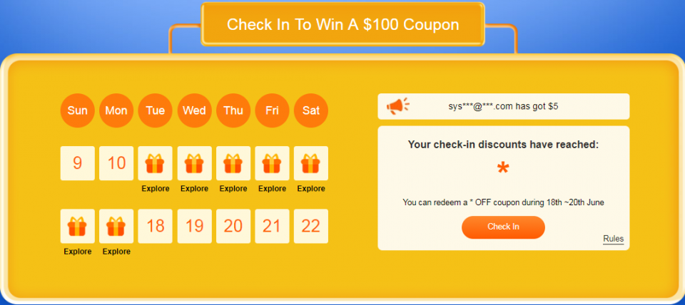 Încălzirea se face prin “Check in To Win a 100 dollars Coupon” prin intermediul căreia puteţi câştiga cupoane de reduceri de până la 100 de dolari.