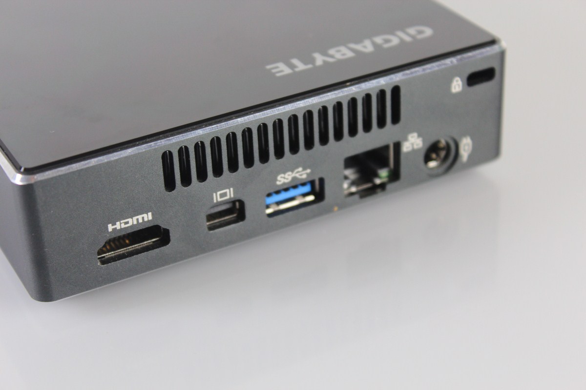 În partea frontală dați de portul USB 3.0, în spate de un alt port USB 3.0. Tot pe spate se află și portul HDMI, miniDisplay port, RJ-45 pentru conexiune la internet pe fir pe lângă modulul Wi-Fi b/g/n inclus, jack-ul pentru încărcător. Butonul de power este în partea superioară, se luminează albastru când mini PC-ul este pornit și nu deranjează vizual.