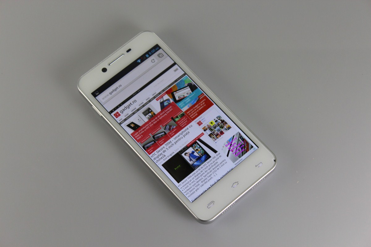 IPS de 5 inch cu rezoluție 1280×720 pixeli. Iese în evidență prin luminozitate, unghi bun de vizualizare, culori plăcute și naturale. La baza display-ului de 5 inch sunt trei taste capacitive, cu rol în controlul sistemului de operare Android. Mă bucur că nu s-au lăcomit la ecran și să pună vreun display de 5 inch cu 480×800 pixeli sau qHD / 540×960 pixeli, au ales direct să pună 1280×720 pixeli.