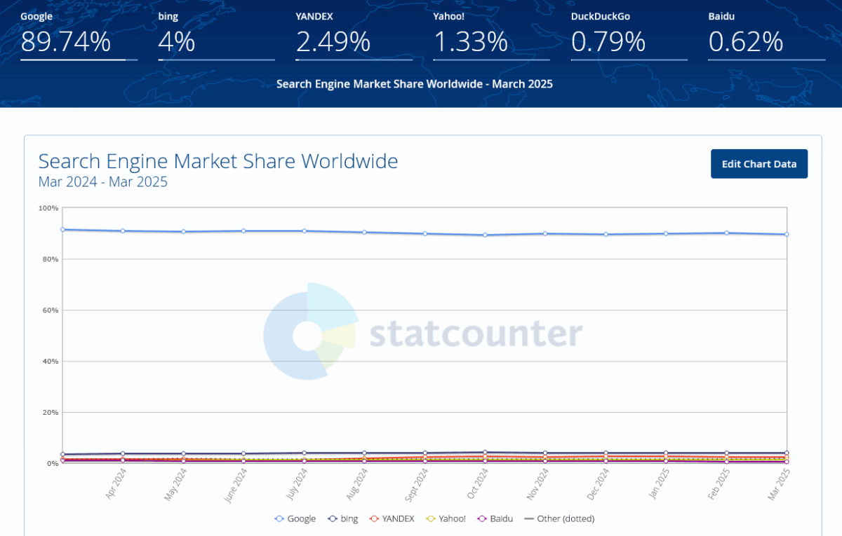 Conform celor mai recente statistici statcounter.com, la nivelul lunii martie 2025, Google avea un market share general (sunt incluse toate platformele) de aproape 90%. La mare, dar foarte mare distanţă se mai regăseau bing cu 4%, Yandex cu 2.5 %, Yahoo! cu 1.3%, DuckDuckGo cu 0.8% şi Baidu cu 0.6%.
