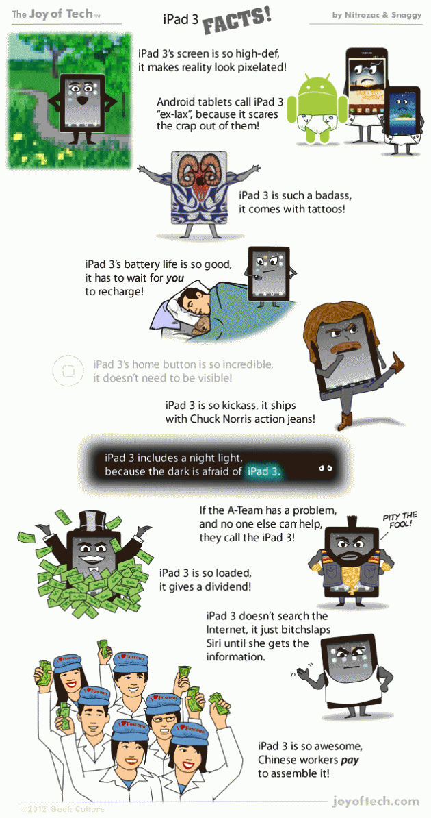 În 3 zile vom afla toate detaliile despre noua tabletă a celor de la Apple, iPad 3. Până atunci, vă prezentăm câteva glume destul de reuşite despre această tabletă. Glumele sunt în limba engleză şi nu le-am tradus pentru că şi-ar pierde din farmec. Sper ca acest lucru să nu fie un impediment pentru voi.