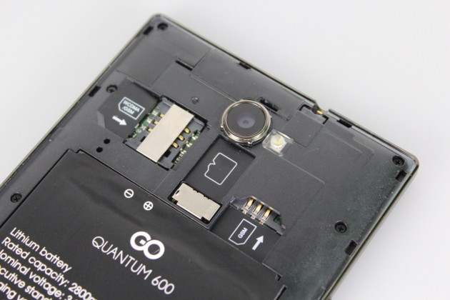 Ca design, Quantum 600 se prezintă cu niște colțuri ușor rotunjite și un spate plat ce se curbează puțin spre margini. Capacul sub care se ascunde acumulatorul este dintr-un plastic mat, cauciucat, ce contribuie din plin la un grip bun. Se desface ușor, iar odată terminată această operațiune avem acces la acumulator – ce poate fi scos, la cele două SIM-uri de dimensiuni normale și la cardul microSD. Phablet-ul este înconjurat pe margini de un metal ce își folosește proprietățile pentru un plus de rezistență. Acesta are o culoare plăcută pe care eu am catalogat-o ca fiind un maro închis cu o tentă de violet.