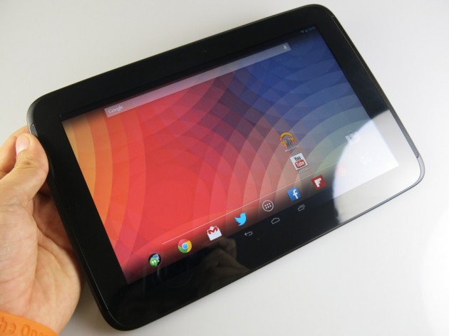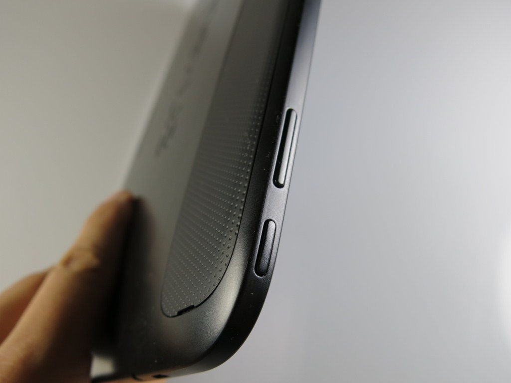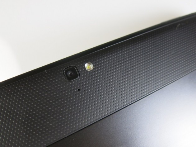 Oferă un grip excelent, nu simți că-ți va scăpa din mâna și asta deși avem de-a face o tabletă de 8.9 mm grosime. Când strângi device-ul în mână nu scoate niciun sunet și asta relevă o calitatea a fabricației fără reproș. Zona cu camera foto de 5 Megapixeli și LED-ul flash din spate sunt prinse într-un spațiu cauciucat. Spatele lui Nexus 10, deși este mat adună amprentele destul de rapid.