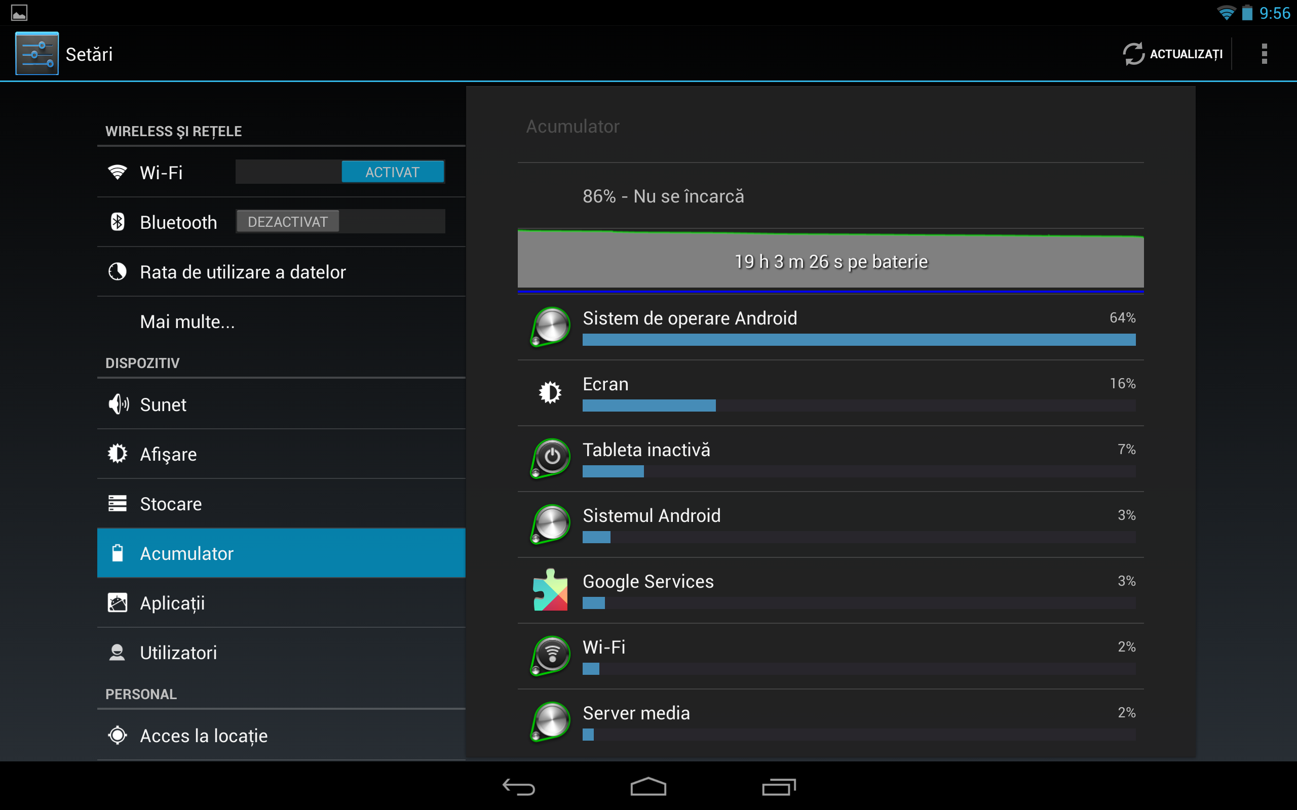 Baterie de 9000 mAh. Mi-a fost teamă că va sta prost la acest capitol având în vederea rezoluția display-ului, CPU dual-core tactat destul de sus, dar m-am înșelat. Google Nexus 10 livrează 7 – 8h de autonomie în condiții de utilizare intensivă. Trece testul unei zile în condiții de utilizare moderată fără nicio problemă. Bravo Samsung, bravo Google. Doar tabletele ASUS cu tastatură dock mai ajunge la asemenea valori.