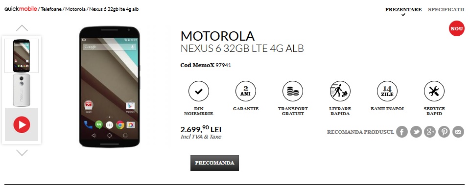 După cum ne-au obişnuit încă de la lansarea sa, site-ul quickmobile.ro aduce de fiecare dată în premieră în România cele mai noi gadget-uri lansate la nivel internaţional. Acelaşi lucru se întâmplă şi cu proaspetele lansări Google Nexus 6 şi Google Nexus 9. Acestea sunt deja disponibile la precomandă pe site, lucru ce vă garantează că imediat ce aceste terminale ajung fizic pe continentul european, veţi fi printre primii deţinători din ţara noastră. Desigur, acest lucru atrage cu sine şi un preţ uşor mai ridicat.