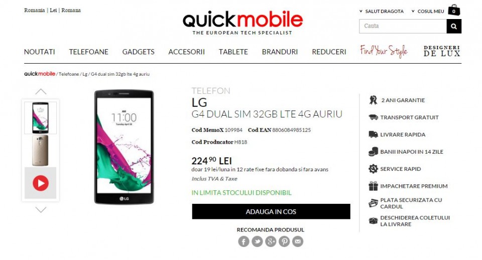 LG G4 dual-sim – 223 lei 2249 lei la QuickMobile (prețul a fost actualizat după peste 9 ore în care a fost menținut la 223 sau 225 lei).