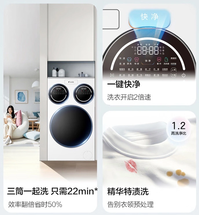 Promovată drept o maşină de spălat pentru leneşi, modelul Haier XQGL125-MBLDE697WU1 are 3 cuve astfel: