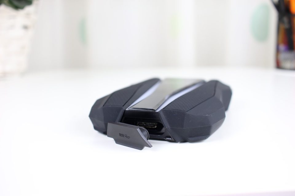 LED-urile RGB se află în partea superioară. HDD-ul de 2 TB are o protecție în trei straturi și înțeleg cum au obținut certificările IP68 și MIL-STD810G. Zici că este îmbrăcat într-o husă din plastic cauciucat. Au sacrificat dimensiunile sale spre a-l face cât mai rezistent.