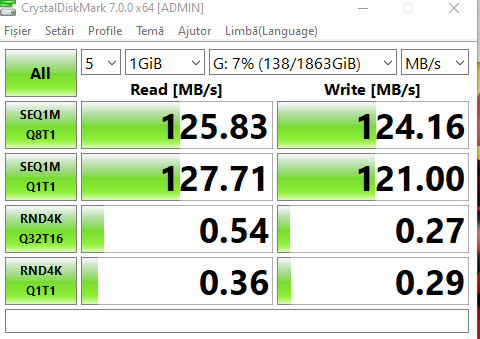 A obținut 125.85 MB/s la citit și 124.16 MB/s la scris.
