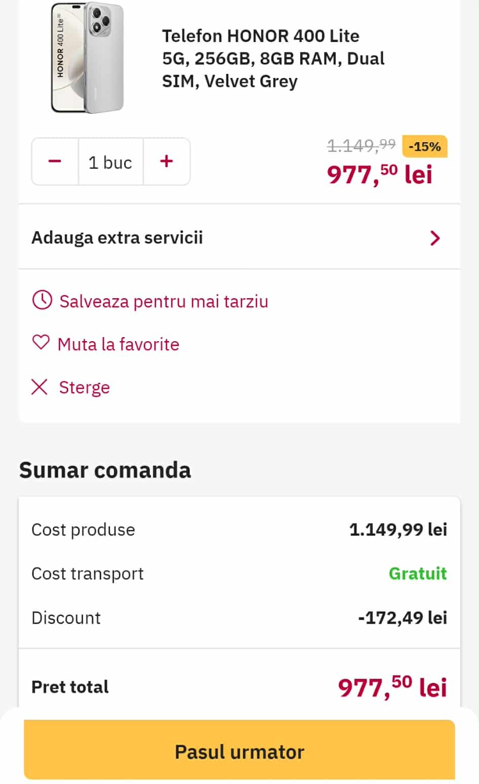 După ce veţi finaliza acest proces, veţi beneficia de un preţ final de achiziţie de 977.50 lei (preţul este valabil pentru opţiunea cu ridicare din magazin, livrarea prin curier mai costă în plus 14.9 lei).