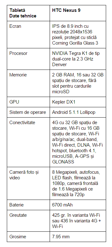 Am testat varianta Wi-Fi only, dar Nexus 9 are și versiuni cu 3G și 4G, suport pentru cartele de tip microSIM. Modelul sosit la review dispunea de 16 GB spațiu de stocare din care 11.5 GB în mod real, Wi-Fi în standardele a/b/g/n/ac, dual-band pe 2.4 și 5 GHz, DLNA, Wi-Fi hotspot, bluetooth 4.1, A-GPS și GLONASS.