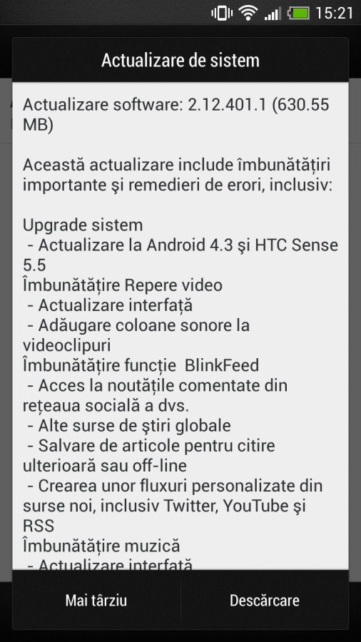 Trebuie să punctez că update-ul via OTA sosește prima dată pe HTC One Mini-urile cumpărate la liber, fără a fi achiziționate prin intermediul unui operator telecom. Cei care au cumpărat HTC One Mini de la Vodafone, Orange etc mai au de așteptat. Presupun că în câteva zile sau săptămâni va sosi 4.3 Jelly Bean + Sense UI 5.5 și pe modelele de One Mini procurate la abonament / prelungire de contract.