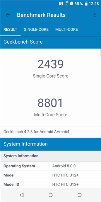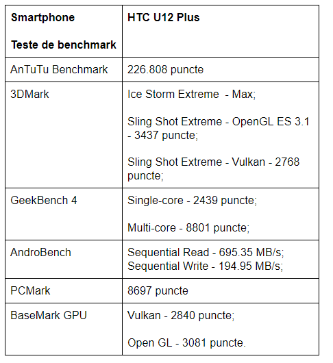 Qualcomm Snapdragon 845 este unul dintre cele mai apreciate procesoare integrate pe smartphone-urile high-end, iar în cazul lui U12 Plus nu face notă discordantă. Rezultatele sunt bune spre foarte bune, iar asta se vede și în experiența de utilizare oferită.
