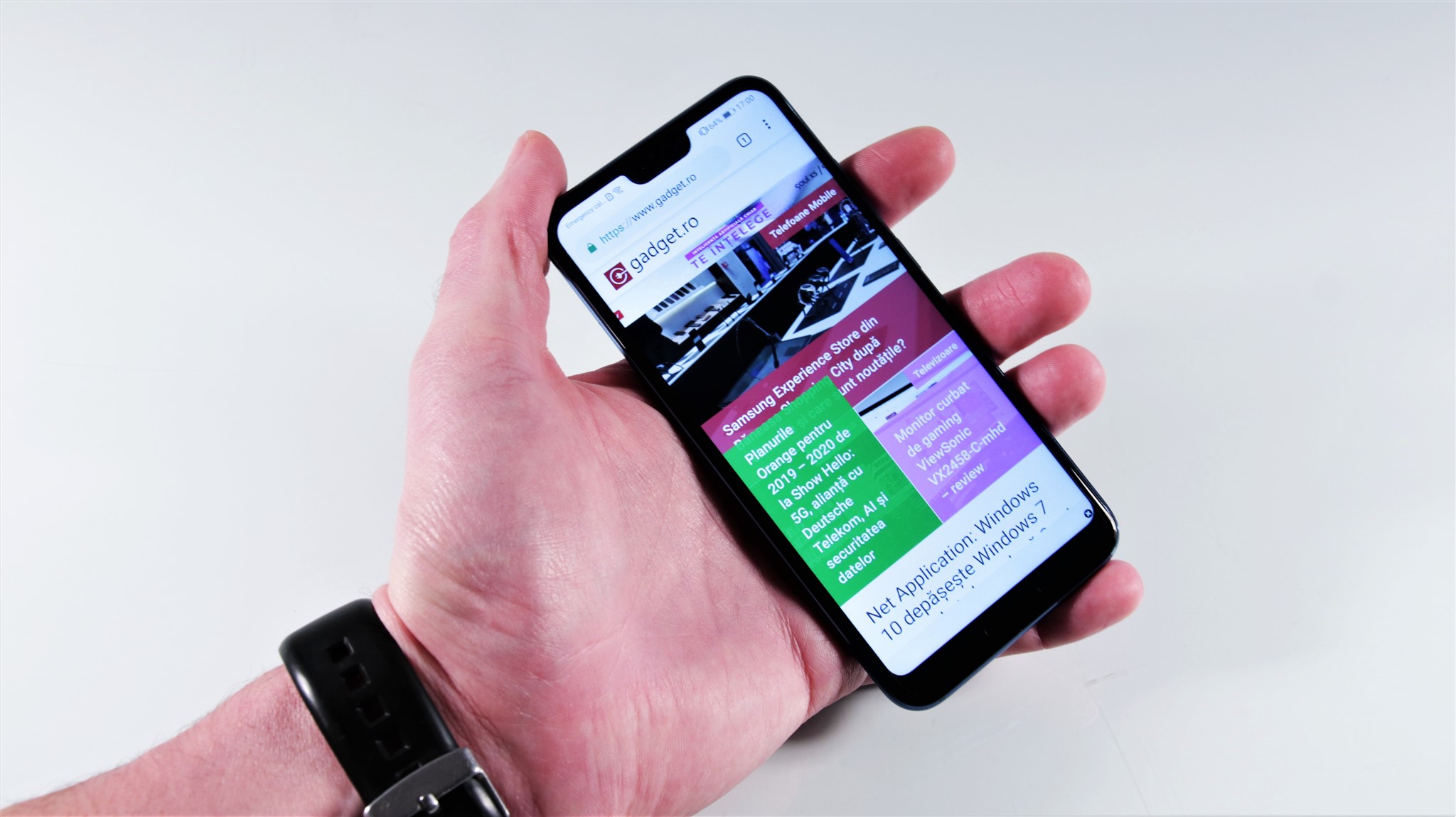 Pe lângă notch, avem și colțuri rotunjite, precum și aspect 19:9. Astfel, rezoluția este una FullHD+ 2280 x 1080 pixeli. La o diagonală de 5.84 inch rezultă o densitate de circa 432 ppi, una suficientă pentru ca display-ul IPS să nu aibă niciun fel de probleme cu conturarea exactă a oricărui fel de imagine.