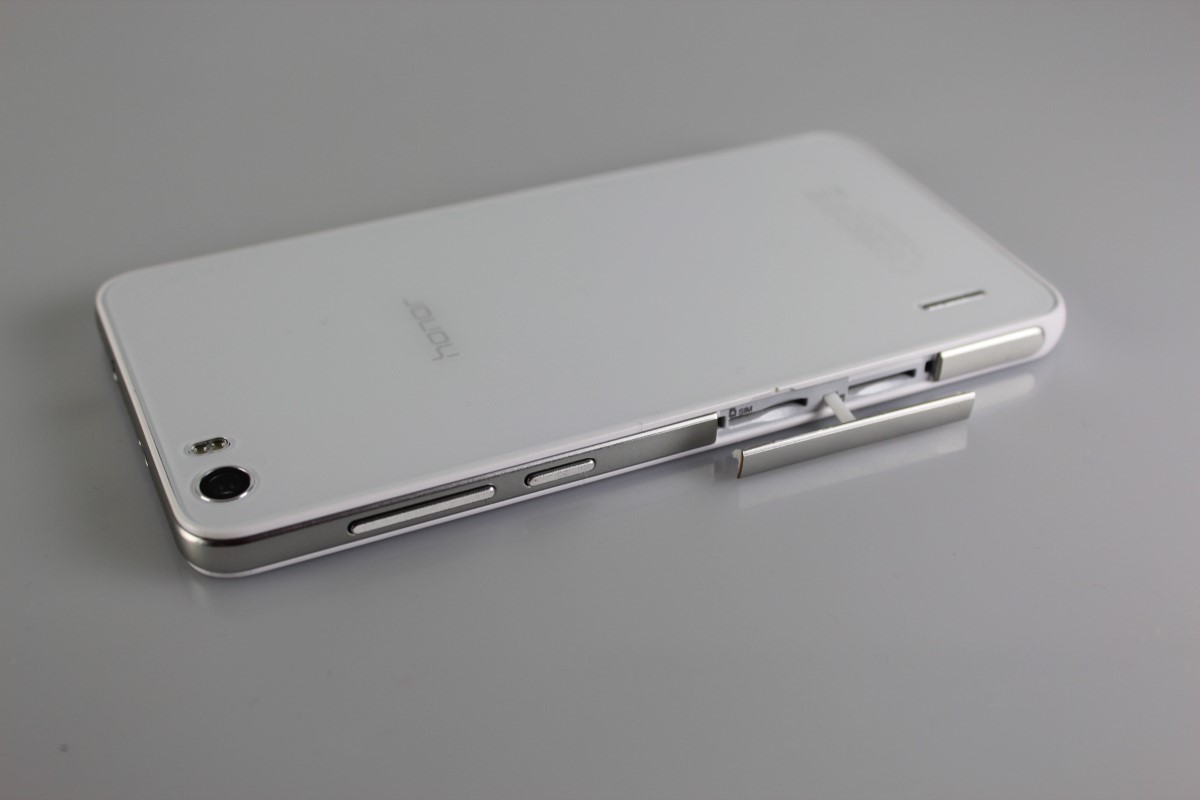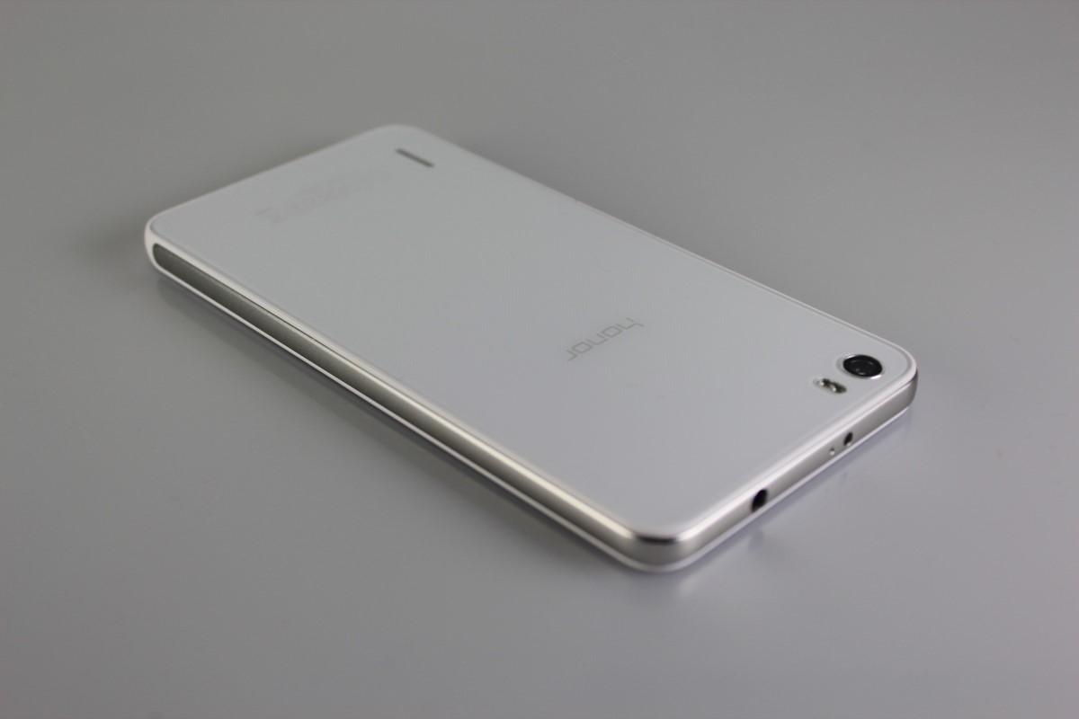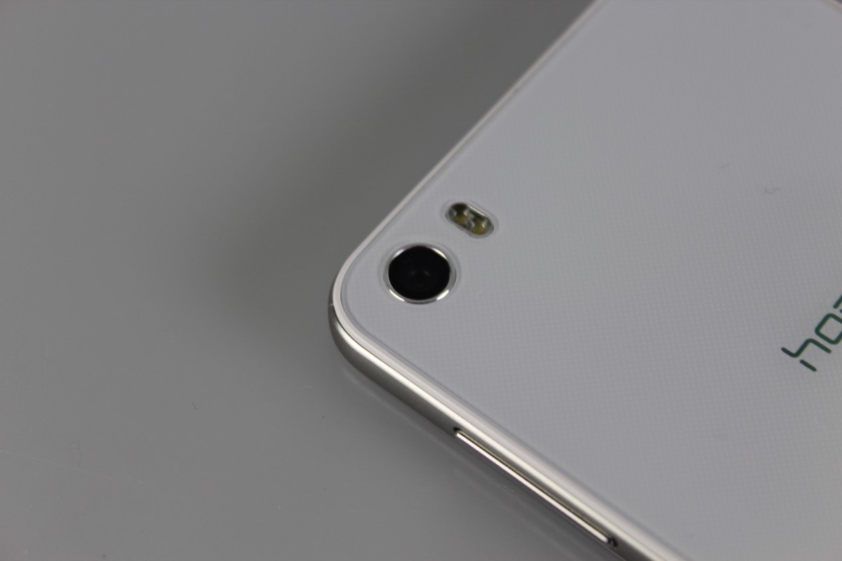 Lipsește brandul Huawei în partea frontală, la Huawei Ascend G7 îl regăsiți în partea superioară, deasupra display-ului. Pe spatele device-ului sosit la review regăsiți termenul Honor și nimic în plus, denumirea companiei lipsește cu desăvârșire.