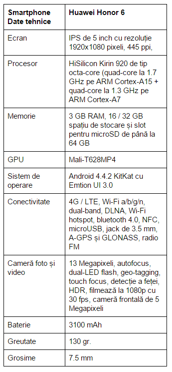 Specificațiile complete pentru Huawei Honor 6, varianta europeană: