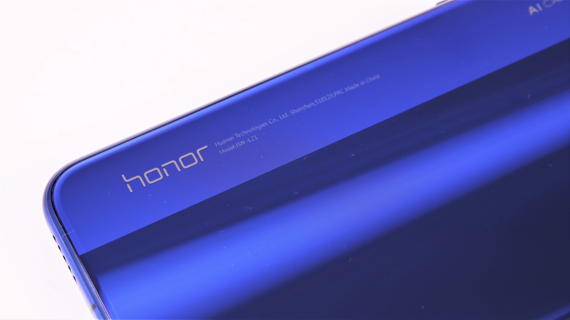 Honor 8X poate fi cumpărat în mai multe versiuni de culoare, noi am primit-o pe cea albastră. Această nuanță se păstrează pe spatele din sticlă, dar și pe lateralele din metal. Sub sticlă este un model ce produce reflexii interesante, în funcție de cum cade lumina pe dispozitiv. Există pe spate și o fâșie de altă nuanță, cu alt model, ce merge pe lungimea telefonului, în dreptul camerei principale.