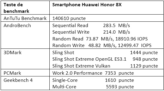 Testele de benchmark relevă un procesor puternic, suficient de bun pentru zona unde concurează Honor 8X, dar un GPU ce nu se ridică la același nivel. Am de apreciat vitezele memoriei interne, peste ceea ce am mai întâlnit în zona mid-range.