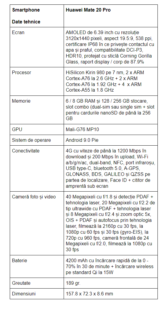 Mate 20 Pro se dorește a fi un telefon impecabil ca hardware și software, iar în articolul de față descoperiți dacă au găsit rețeta perfectă. Cert este că avem îmbunătățiri importante la capitole cheie: încărcare rapidă + wireless a acumulatorului ce urcă la 4200 mAh, cel mai bun raport display / corp din piața de telefoane mobile, rezoluție mare a ecranului curbat, cameră cu setup nou (wide  + ultrawide + tele), primul procesor din universul Android pe 7nm, cititor de amprentă sub ecran, certificare superioară față de P20 Pro în ce privește contactul cu apa și praful, cameră ce nu iese în relief față de profilul părții spate etc.