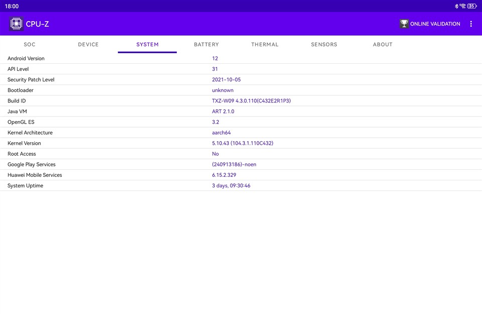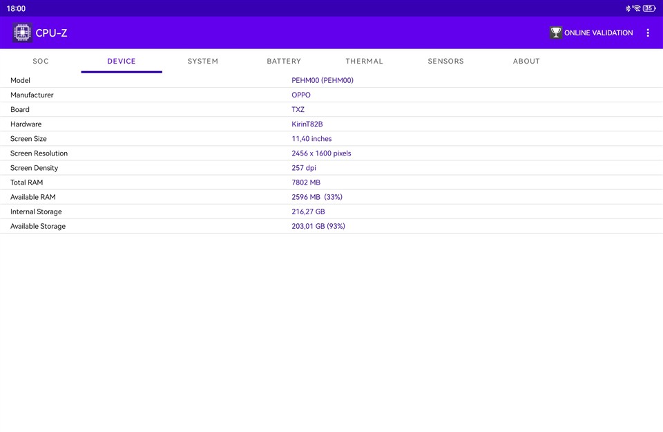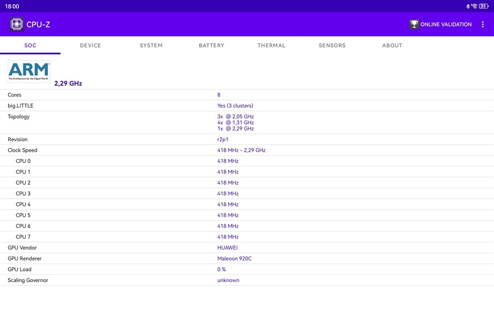 Capturi de ecran din aplicația CPU-Z cu informații despre Huawei MatePad 11.5 2025 PaperMatte Edition: