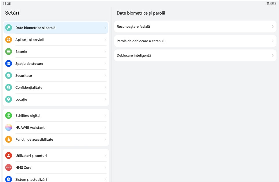 Mi se pare că Huawei MatePad 11.5 2025 PaperMatte Edition merita și un senzor de amprentă, nu are un astfel de element de siguranță. Tot ce poți activa pe această zonă este recunoaștere facială, care se face doar prin intermediul camerei frontale, deci nu este neapărat cea mai sigură metodă de deblocare…